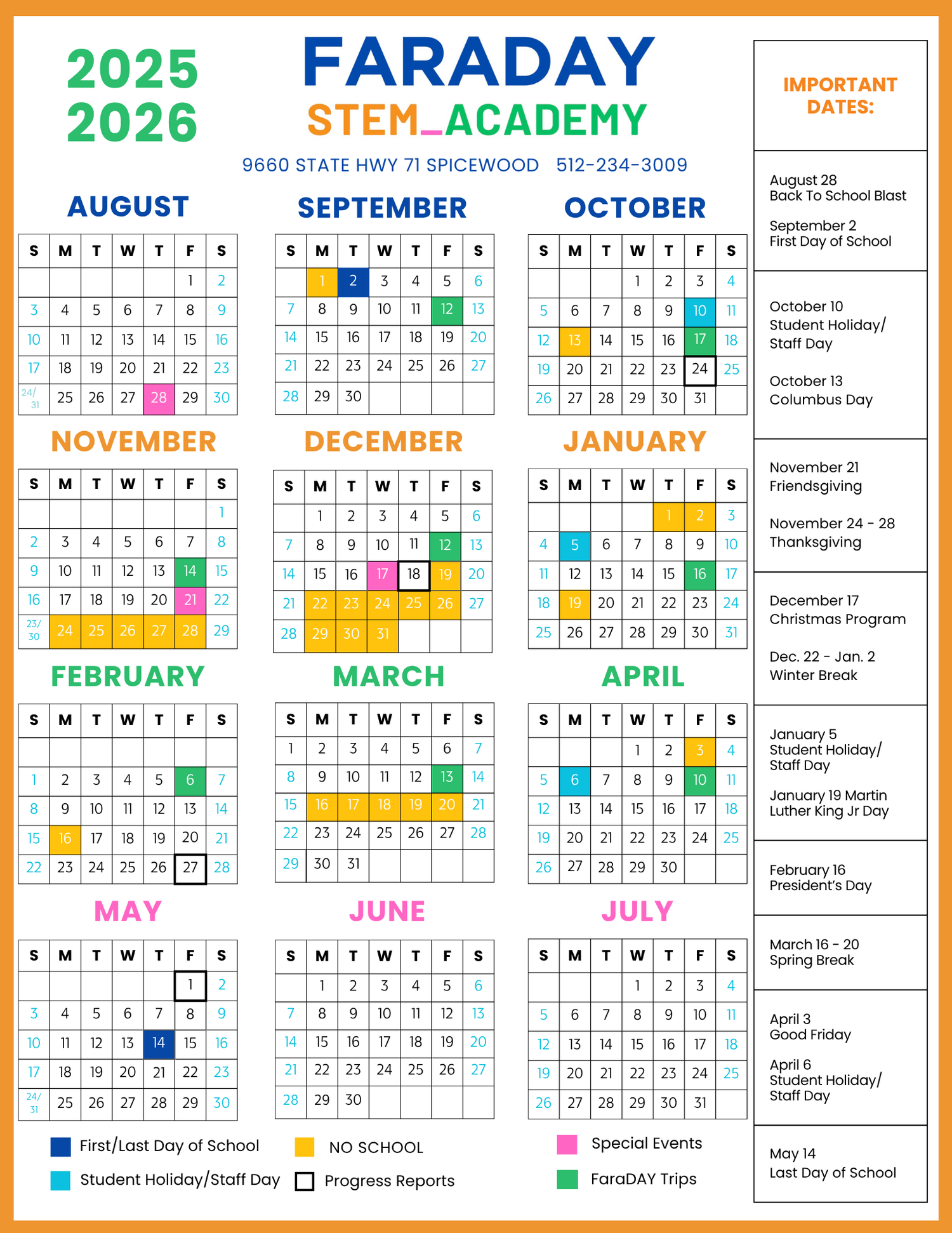 Stay up to date with important dates, holidays, events, and academic schedules at Faraday STEM Academy. Check back regularly for the latest updates throughout the school year.
