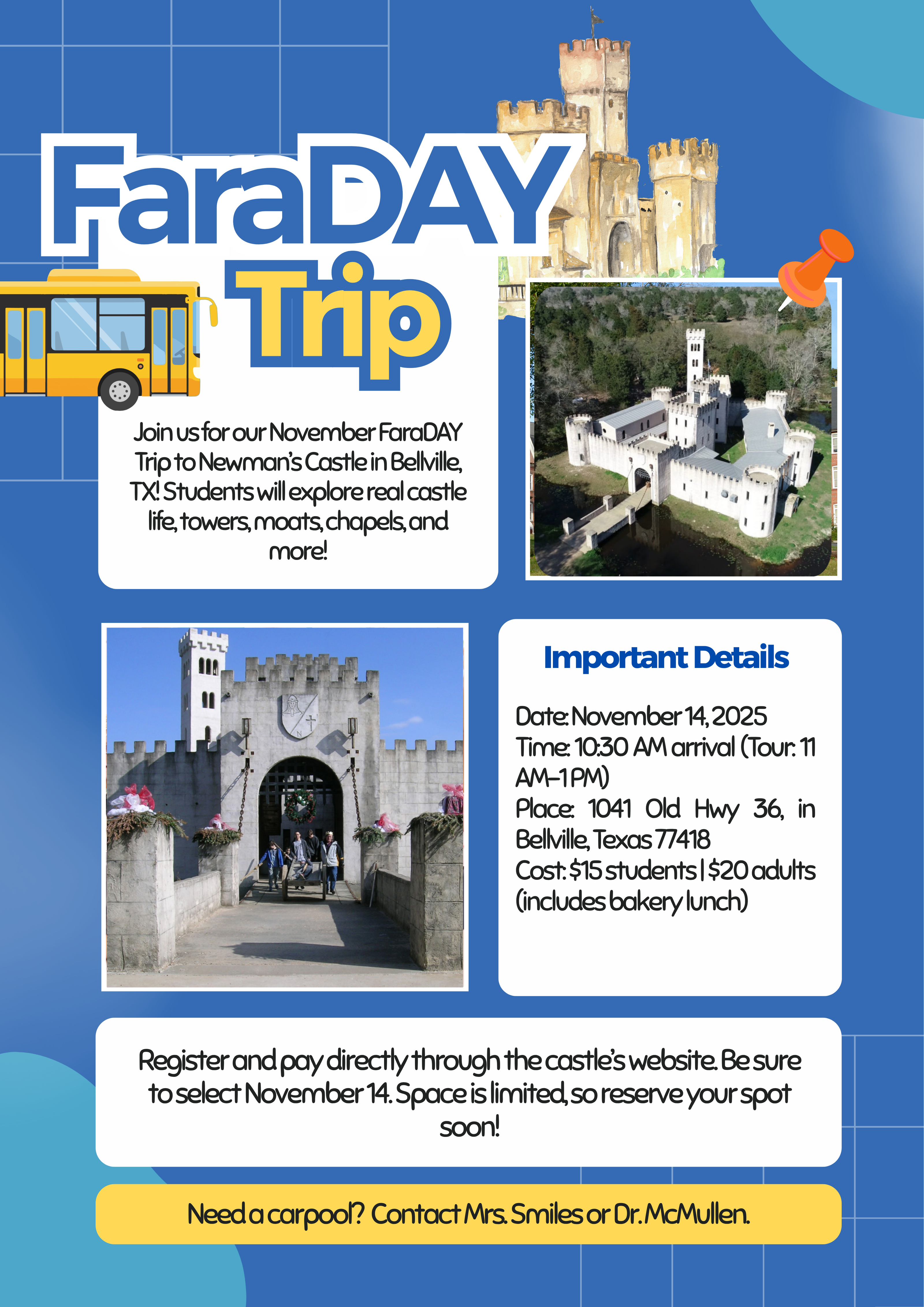 RegisterJoin us for an exciting field trip to Newman’s Castle in Bellville, TX! Students will experience real castle life while exploring towers, moats, and more.